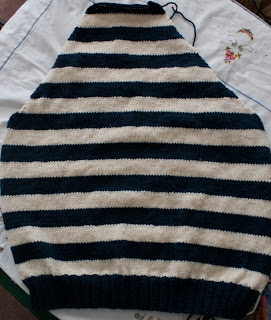 I also put in some hours towards my knitting project. I was able to finish the back panal, and get started on the front. I encountered a bit of difficulty early on in the front and had to pull out some of my hard work (I like to call these "knitting adventures"...sometimes they can lead to things like punching holes in doors). Heres a look at what I have finished so far: